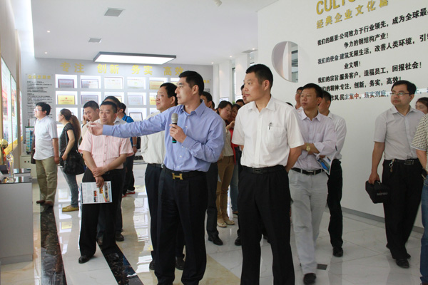 考察團一行參觀了經典集團的文化館、項目中心、綜合辦公室、營銷中心和生產車間。苗樹文董事長向考察團介紹了經典集團的生產經營、項目建設、產學研合作、技術創新等情況。隨后,考察團一行實地參觀了經典集團職工培訓室、閱覽室、乒乓球室、臺球室、愛心超市和宴會廳,進一步了解了企業的文化建設有關情況。