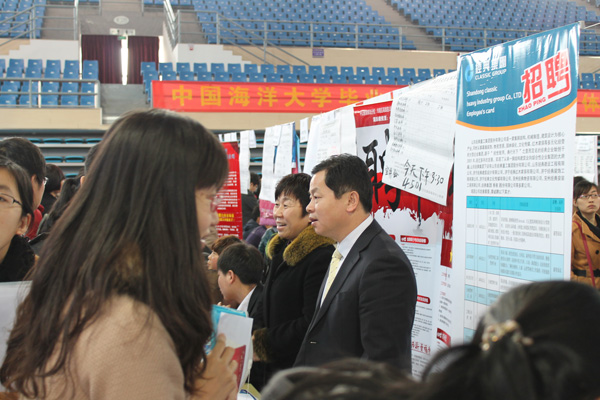 3月28日,繼青島理工大學2013年春季畢業生雙選會結束后,經典集團又一次組織參加中國海洋大學畢業生雙選會。我公司董事長苗樹文,總經理杜福生等領導一同參加了此次雙選會。