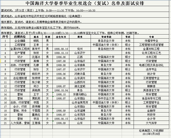 雙選會現場畢業生共投遞我公司簡歷315份,經過初試篩選,進入復試人員21位,具體復試安排及進入復試人員名單請參考《中國海洋大學春季畢業生雙選會(復試)名單及面試安排》。