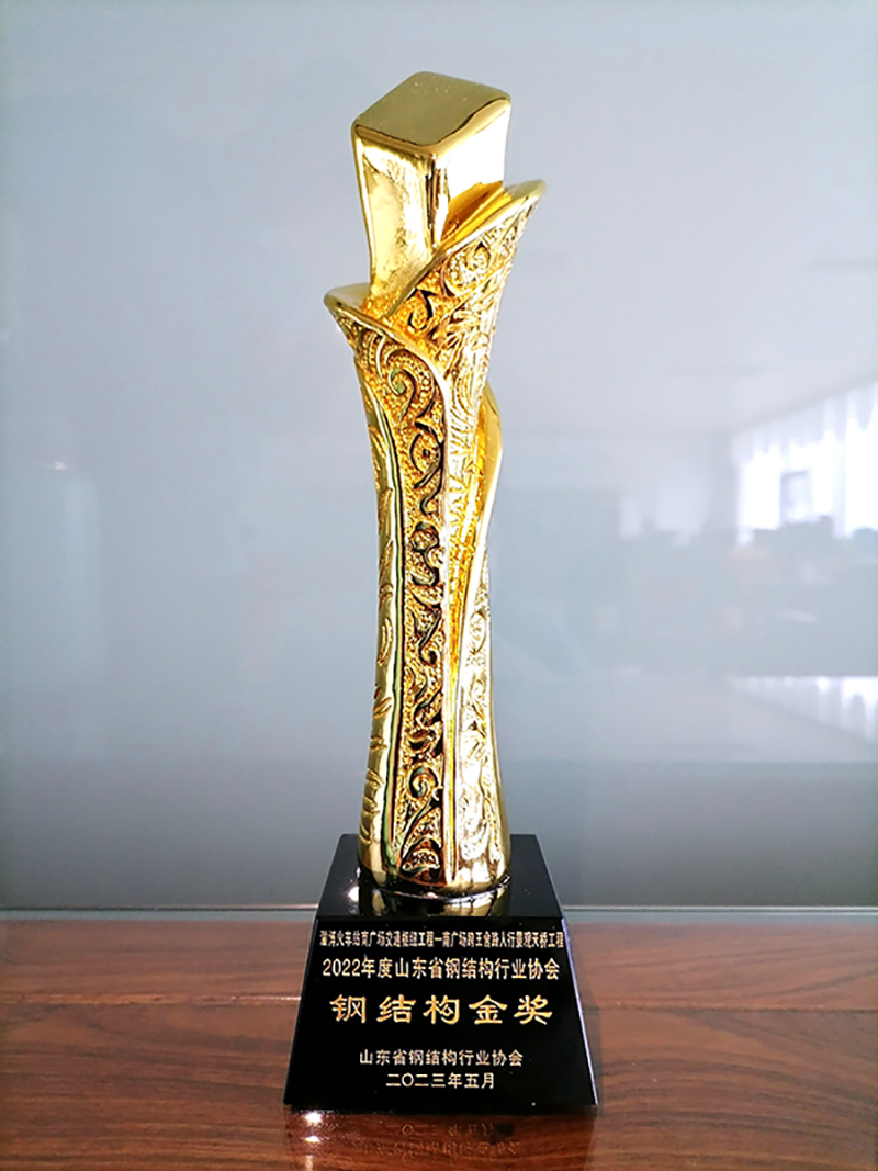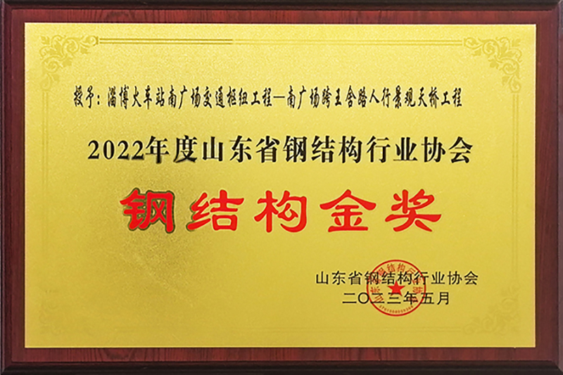 6月16—18日在環(huán)渤海地區(qū)鋼結構行業(yè)發(fā)展峰會暨山東省鋼結構行業(yè)協(xié)會年會上,山東經(jīng)典重工集團股份有限公司承建的淄博火車站南廣場交通樞紐工程——南廣場跨王舍路人行景觀天橋工程榮獲2022年度山東省鋼結構協(xié)會鋼結構金獎。